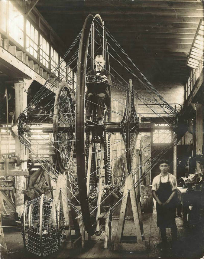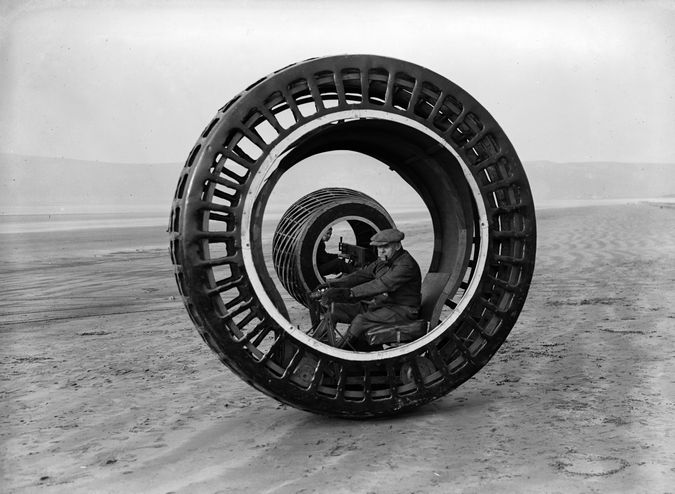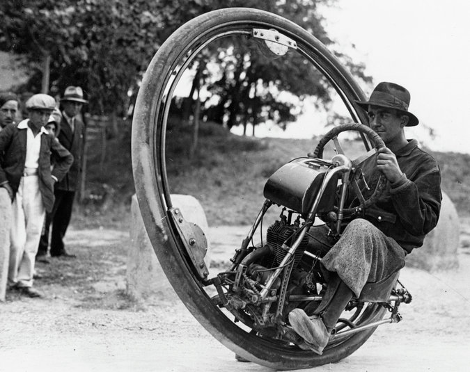 獨(dú)輪摩托的基本原理很好理解:造一個(gè)足夠大的輪子,然后坐進(jìn)去,再放一個(gè)能夠驅(qū)使獨(dú)輪摩托滾滾向前的發(fā)動(dòng)機(jī)。早期版本以各種發(fā)動(dòng)機(jī)(燒氣的,使電的,腳蹬的)和裝備的組合為特色,據(jù)說時(shí)速還一度達(dá)到93mph——盡管制造商吹牛是名聲在外。