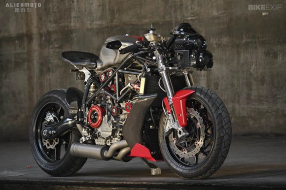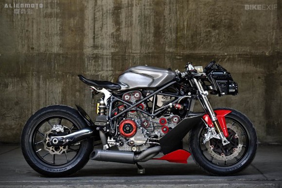 此外,引擎也已被更換為749R的那顆更輕量化也更強力大心臟,得益于競賽級別的凸輪和鈦合金的活塞的加持,這款Ducati 749已是脫胎換骨。而那些熱力驅(qū)動的皮帶輪更多地強化了車體的視覺沖擊感(外貿(mào)控當然最愛這些裝飾件,但是如此充滿機械朋克感的組件誰又不喜歡呢?)