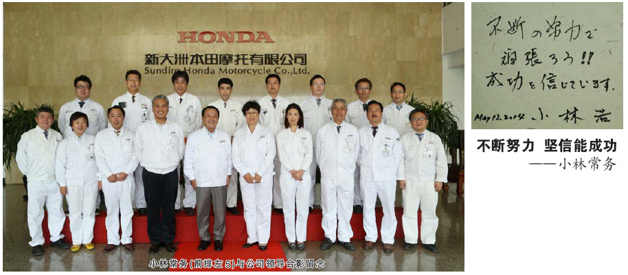 2014年5月13日,本田技研工業(yè)株式會社小林常務(wù)到訪新大洲本田,并題詞“不斷努力,堅信能成功”與SDH全體員工共勉。