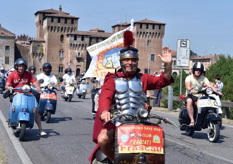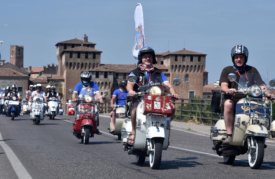 2014年6月14日,VESPA摩托車愛好者在活動中一同騎行。 當(dāng)日,2014年世界VESPA摩托車日在意大利倫巴第大區(qū)曼托瓦市舉行,來自世界各地的VESPA摩托車愛好者相聚這座意大利北部小城共同騎行。VESPA是產(chǎn)自意大利的經(jīng)典摩托車;電影《羅馬假日》男女主人公的扮演者派克和赫本騎的就是此車。