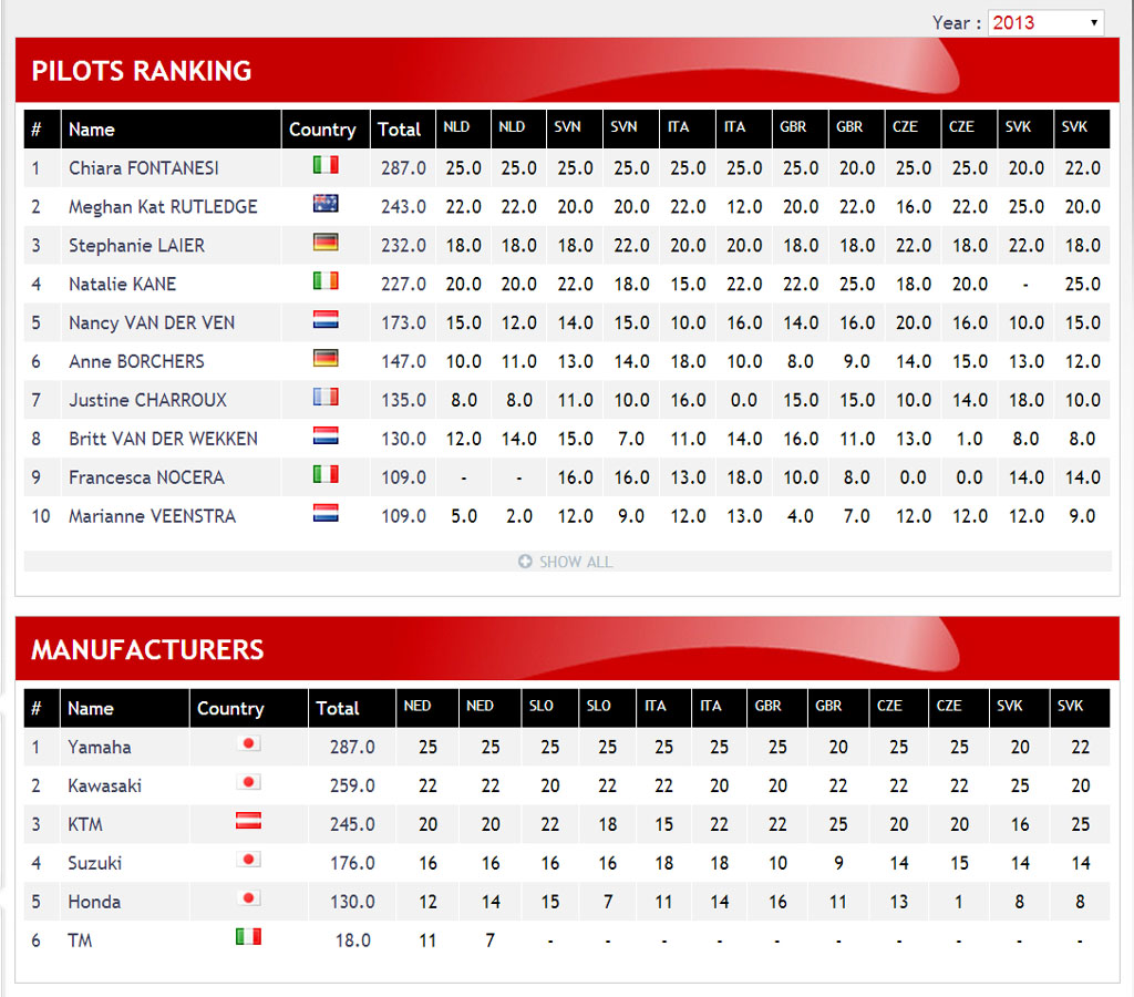 下圖:2013' FIM 世界女子越野錦標(biāo)賽積分榜(前十名)