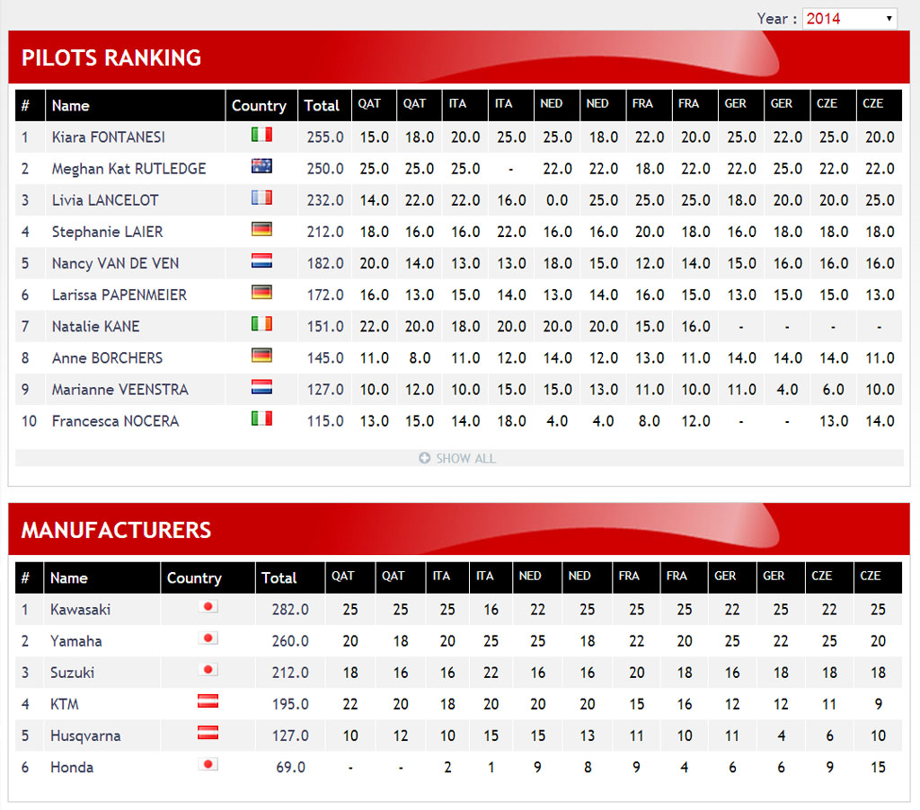 下圖:2014' FIM 世界女子越野錦標(biāo)賽積分榜(前十名)