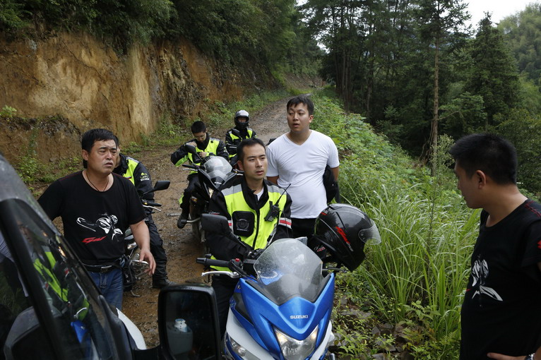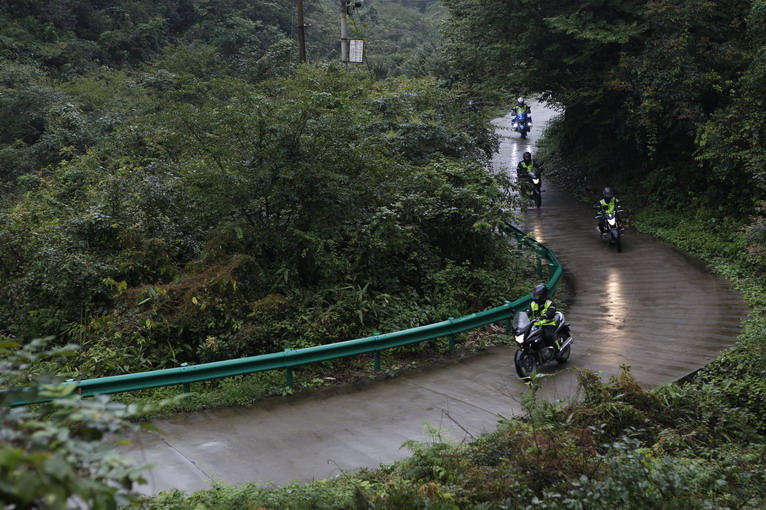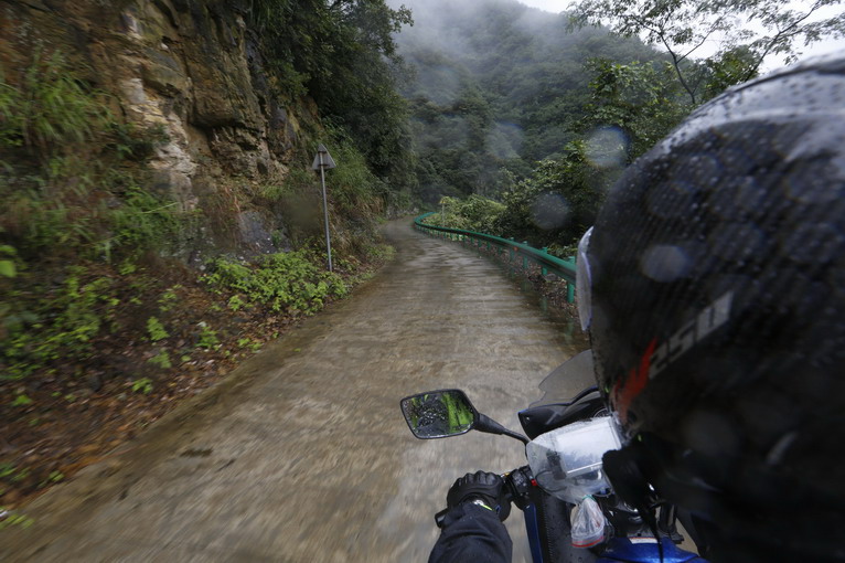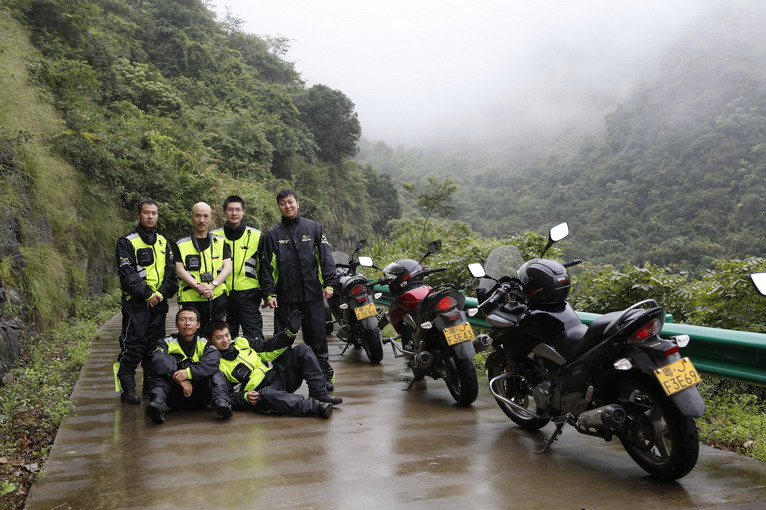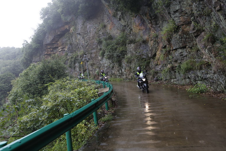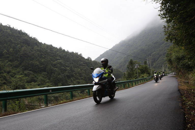 由于大路修路的原因,今天的涇縣——屯溪,依然取道大山,第一個經(jīng)過的,就是著名的壓彎天堂——桃?guī)X。桃?guī)X的彎道狹窄險峻,比昨天的山路有過之而無不及。才上桃?guī)X,天上下起了大雨,大家只能穿上雨衣,低速行駛。