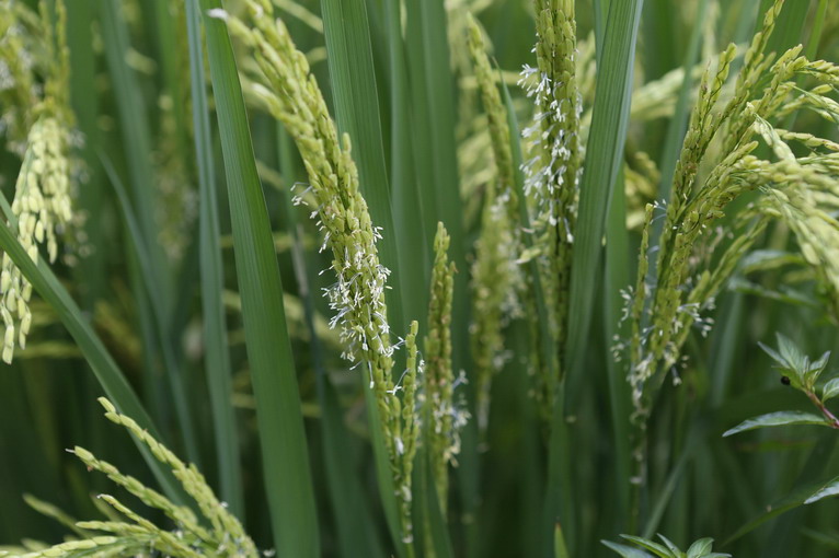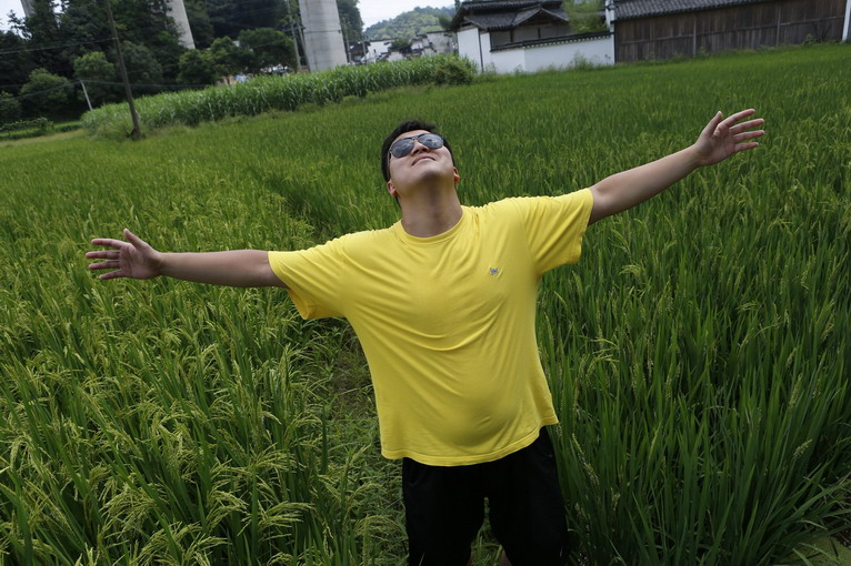 騎手李崢嶸和大片的稻田。