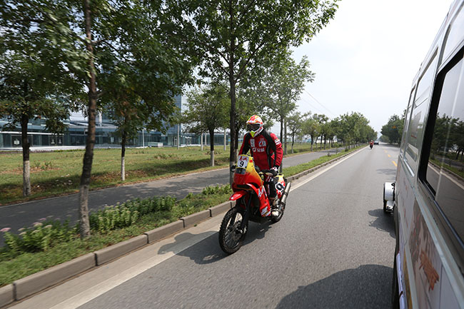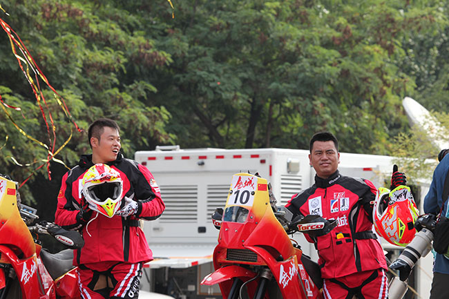 車隊領(lǐng)隊隋全武介紹,出征儀式開始前一夜,他們也經(jīng)歷一場考驗(yàn),“兩位車手27號來到北京后,發(fā)現(xiàn)車隊預(yù)定的頭盔是小版,無法穿戴,只能緊急從香港訂購并快遞到賓館。但是,由于快遞延誤,前去首都機(jī)場等頭盔的兩位車隊成員整整等了8個小時,直到今天清晨四點(diǎn)才拿到頭盔,這才保證了兩位車手按時參加今天的發(fā)車儀式。”