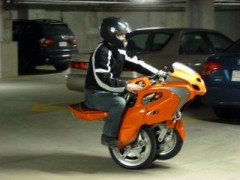 這款在國際電子消費展上亮相的變形摩托車,雖然不像電影《變形金剛》里博派或狂派那樣可以變身為會說話的機器人,但它能從單輪車瞬間變成標(biāo)準(zhǔn)雙輪摩托車。這輛折疊車采用了賽格威系統(tǒng),當(dāng)單輪行駛時能夠保持良好的平衡性能,車身緊湊靈巧,很適合在擁擠的街道行駛。當(dāng)?shù)竭_(dá)開闊地帶后,駕駛者只需按下變形按鈕,便可完成變形過程。據(jù)稱,這輛摩托車最高時速可達(dá)35英里每小時,預(yù)計將于明年上市。