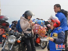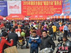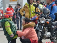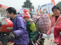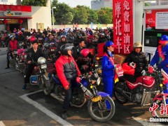 2015年2月10日,廣東省佛山市,龍山加油站,上千名準(zhǔn)備返鄉(xiāng)的摩托大軍在此免費(fèi)加油,準(zhǔn)備踏上回家的路。隨著廣東珠三角工廠春節(jié)前相繼放假,一批批打工的人們采取騎摩托車(chē)的方式返回家鄉(xiāng)。今年這一數(shù)字達(dá)到60萬(wàn),他們匯成的“摩托大軍”成為春運(yùn)路上一道別樣的景觀。