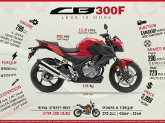 本田CB300F與CBR300R屬同平臺(tái)車型,共享車架和286cc的單缸電噴發(fā)動(dòng)機(jī)。發(fā)動(dòng)機(jī)本身與CBR250R動(dòng)力配置大體相同,活塞行程由55毫米增加到63毫米。使用37毫米正立式減震,118mm的行程和Pro-link后中置減震,彈簧預(yù)緊度五檔調(diào)節(jié)和113mm行程。CB300F不配置ABS防抱死制動(dòng)系統(tǒng)。CB300F作為入門街車具有較強(qiáng)的價(jià)格優(yōu)勢(shì)。