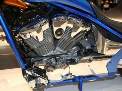 本田VT1300CX 是2009年四月在東京車(chē)展上大放異彩的Honda全新車(chē)款,搭載全新1300cc水冷V型雙缸引擎,VT1300系列在改裝的空間上預(yù)留了諸多伏筆。VT1300CX具有美式手工改裝車(chē)的基本造型,并蘊(yùn)含了Honda高階的造車(chē)科技。本田VT1300CX的出現(xiàn),確實(shí)為純手工打造車(chē)廠(chǎng)帶來(lái)了前所未有的沖擊。2015年大阪摩托展上本田發(fā)布了新款VT1300。