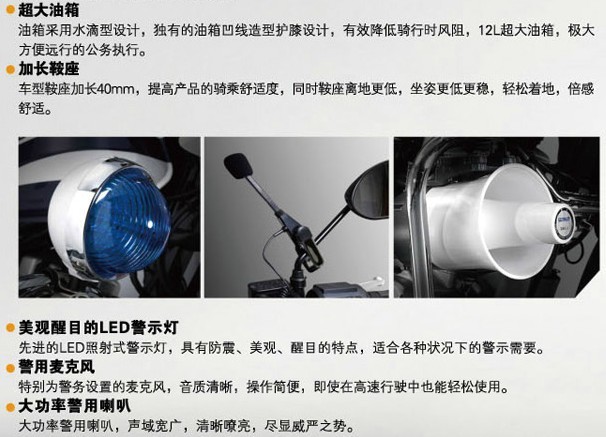 美觀醒目的LED警示燈,先進(jìn)的LED照射式警示燈,具有防震、美觀、醒目的特點,適合各種狀況下的警示需要。警用麥克風(fēng),特別為警務(wù)設(shè)置的麥克風(fēng),音質(zhì)清晰,操作簡便,即使在高速行駛中也能輕松使用。大功率警用喇叭,聲域?qū)拸V,清晰嘹亮,盡顯威嚴(yán)之勢。