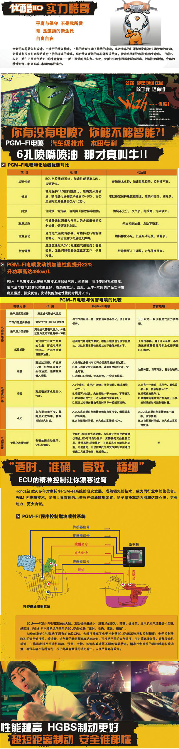 優(yōu)酷110實力酷哥,平庸和保守,不是我所愛!哥就是激揚的新生代自由自在。全新的車前轉(zhuǎn)向燈設(shè)計,由凌厲的線條構(gòu)成,上挑的造型充滿了挑戰(zhàn)的沖動,高透光率的燈罩材質(zhì)閃爍的充滿智慧的靈動,炮筒式燈頭在燈光紋路映襯下仿佛深邃的瞳孔,配合線條英朗的車前罩整流線條,營造出強烈的科技感和生命感。“科技、實力、酷”正式對優(yōu)酷100的精確解讀--酷!哥憑的是實力。如此,優(yōu)酷110的卡通形象躍然而出,以科技的激情,令酷的精神澎湃,漳縣五羊本田的年輕實力。(裸車價格在9900左右)