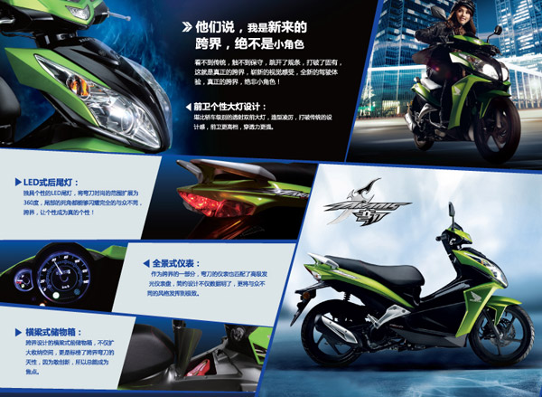 凌厲式線條外觀設(shè)計(jì)外觀設(shè)計(jì)擺脫了傳統(tǒng)踏板封閉、敦厚的特點(diǎn),個(gè)性凌厲的外觀線條令視覺(jué)感與眾不同,懸空上翹的尾部增進(jìn)動(dòng)感,前面板與后尾燈也都進(jìn)行了個(gè)性化的改進(jìn),獨(dú)到的大輪也與傳統(tǒng)踏板完全區(qū)別開來(lái)。