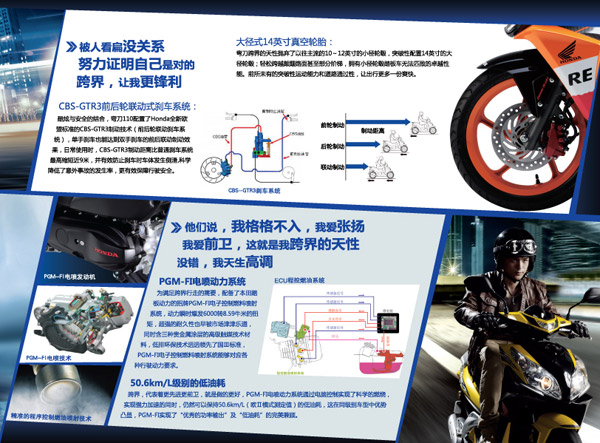 CBS-GTR3前后輪聯(lián)動(dòng)式剎車系統(tǒng):酷炫與安全的結(jié)合,彎刀110配置了Honda全新歐盟標(biāo)準(zhǔn)的CBS-GTR3制動(dòng)技術(shù)(前后輪聯(lián)動(dòng)剎車系統(tǒng)),單手剎車也能達(dá)到雙手剎車