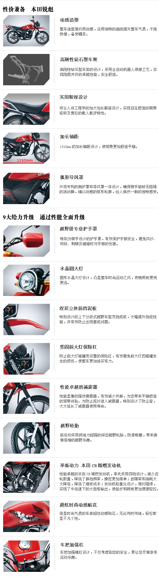 革新動力本田CB精燃發(fā)動機:性能卓越的本田CB精燃發(fā)動機,率先采用四檔設(shè)計,減少齒輪數(shù)量,降低了換檔頻率,換控更加簡單;故障率和油耗大大降低,降低了維修成本;發(fā)動機輕量化設(shè)計,簡約強悍,實現(xiàn)了中低速下的大扭矩輸出,使起步和爬坡更加便速輕松。